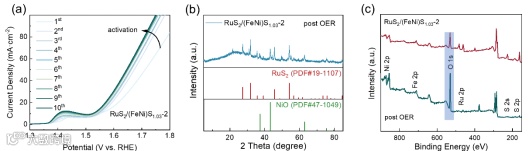 HRTEM与XRD表征结果明确证实,HER反应后的催化剂物相与初始结构相比未发生改变。这种结构稳定性为理解其高效HER活性提供了基础:它确保了异质界面处极低的晶格应变,促进了电子从RuS2到(FeNi)S1.03的转移。在OER条件下展现出智能的“动态”自重构行为。通过反应后的HRTEM与XRD分析,我们直接观测到(FeNi)S1.03相选择性地转化为NiO,并稳定地附着在保持结构的RuS2表面,形成了全新的RuS2/Fe-NiO异质界面。这一动态重构过程是性能提升的关键:新生成的界面极大地促进了O-O键的耦合,有效降低了OER反应的决速步能垒,从而赋予了催化剂卓越的析氧活性。