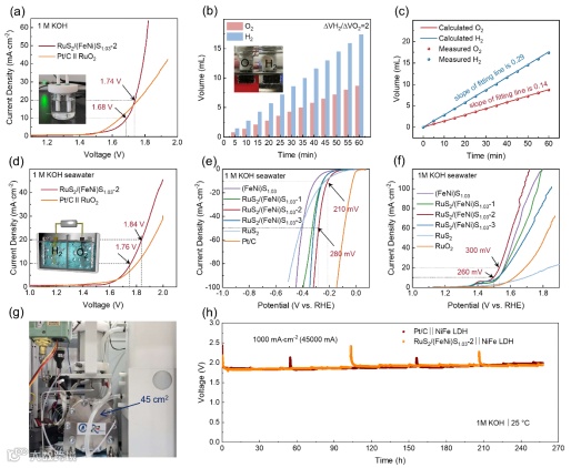 该研究中,RuS2/(FeNi)S1.03双界面协同作用使催化剂在碱性条件下具备出色双功能性能。在整体水分解测试中,10 mA·cm-2电流密度下电池电压低至 1.68 V,海水中为 1.76 V。此外,在工业规模AEM-WE评估中展现出超长的稳定性, 1000 mA・cm-2电流密度下可稳定运行超 250 h,满足大规模制氢的工业寿命标准。综合来看,在实际水分解应用中,RuS2/(FeNi)S1.03是纯贵金属催化剂经济实惠且耐用的替代品。