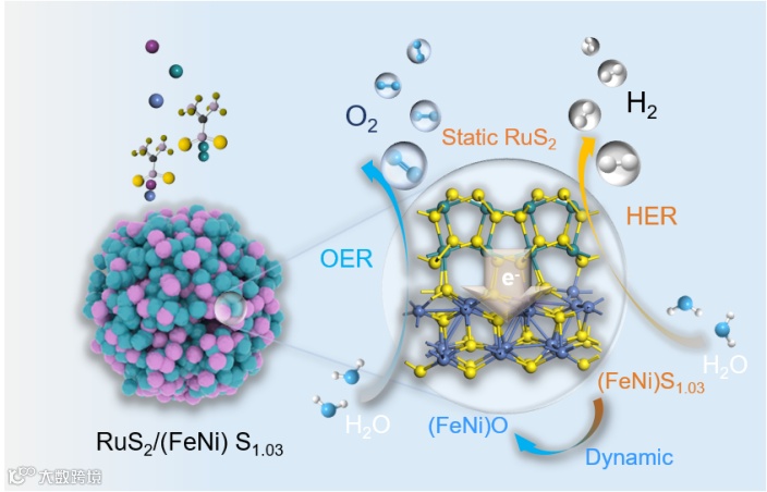 本研究在催化剂设计与反应机制调控方面阐明了一种HER和OER双机制的协同催化体系。通过独特的合成策略,构建了原子级混合的Ru/Fe/Ni前驱体,并成功制备了相应的异质结构催化剂。核心在于构建了具备静态 HER 与动态 OER 双机制协同作用的 RuS2/(FeNi)S1.03异质结构催化剂,打破了传统电催化材料在 HER 与 OER 反应中机制单一、难以兼顾双反应活性的局限。在HER过程中,