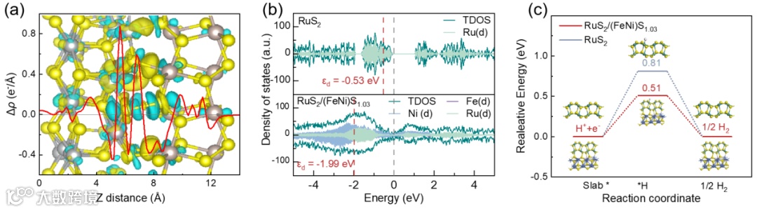 本研究通过DFT计算,将异质界面的增效作用归结为“电子转移→d带调控→能垒优化”的清晰因果链,为理性设计高效界面催化材料提供了坚实的理论范式。差分电荷密度计算直观显示,电子自发地由RuS2侧流向(FeNi)S1.03侧,形成界面电场,为后续的电子结构调控奠定基础。态密度(PDOS)分析揭示,界面耦合导致关键参数——Ru的d带中心从-0.53 eV显著下移至-1.99 eV。这一变化直接削弱了Ru位点对氢中间体(H*)的过强吸附倾向。最终,自由能计算证实,优化后的电子结构将ΔGH从RuS2的0.81 eV理想地调节至0.51 eV,完美解决了原催化剂对H“吸附过强”而难以脱附的关键瓶颈,从而大幅提升HER本征活性。