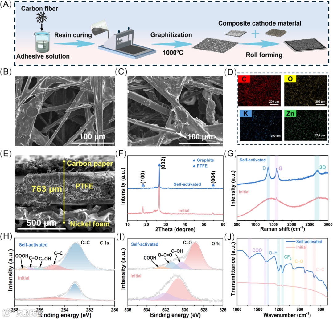 在辊压工艺下构筑出集催化层、集流体和扩散层于一体的集成式空气阴极。碳纤维构建起复杂连通的多孔网络,孔径分布均匀且边缘平滑,而自激活前后骨架形貌基本保持不变,具备良好的机械稳固性。通过多尺度表征证实,自激活过程一方面促进PTFE局部分解并强化碳纤维表面的石墨化程度,另一方面在碳基骨架上原位引入大量–C–OH、–C=O、–COOH 等含氧官能团,为后续电催化反应提供更为有利的界面基础。