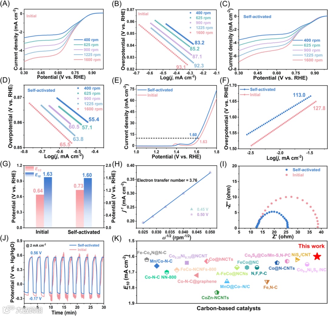 在三电极体系中,自激活策略能够同时降低ORR/OER的能垒。电化学阻抗谱拟合表明,界面电荷传输电阻降低,说明含氧官能团的引入不仅提供化学活性位点,也为电子传输开辟了更多通道,协同提升了材料的电导性与界面反应速率。综合ORR与OER的对比,自激活碳基阴极在不引入任何外加载体和贵金属催化剂的前提下,即可达到部分报道碳基/杂原子掺杂体系的综合催化水平。