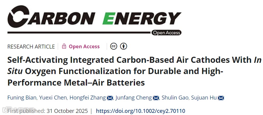 近日,昆明学院胡素娟课题组联合上海交通大学程俊芳团队在Carbon Energy发表题为“Self‐Activating Integrated Carbon‐Based Air Cathodes With In Situ Oxygen Functionalization for Durable and High‐Performance Metal–Air Batteries”的研究论文。该研究成功构建了一种基于电化学自活化策略与一体化结构设计的高性能空气阴极。该电极通过电化学过程在碳基表面原位生成含氧官能团,实现自催化活化,无需额外加载催化剂;同时采用辊压工艺将催化层、集流体与扩散层高效集成为一体化结构,显著提升界面结合力与气体扩散性能。该阴极在无贵金属条件下表现出优异的双功能电催化活性,ORR半波电位E1/2达0.73 V,OER过电位较初始电极降低30 mV。组装后的可充式锌空气电池(RZABs)实现811 mAh g–1的比容量,并在宽温区下保持出色稳定性,连续运行性能优异。