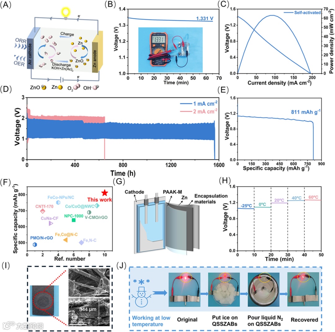 利用自激活一体化空气阴极,构筑了水系RZABs,在1 mA cm-2下,稳定循环1561 h,比容量高达811 mAh g-1。进一步地,组装了“三明治”结构的准固态锌空气电池,在–25–60 ℃的宽温区均表现出良好适应性,且长时间运行后阴极表面与截面仍保持完整无分层和开裂,展现出优异的结构稳定性与抗环境冲击能力。