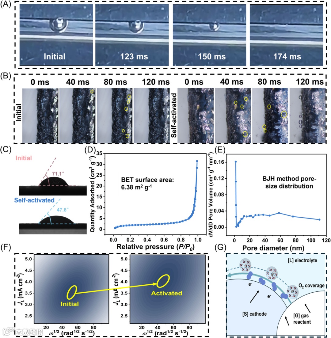 通过原位光学显微镜与气泡扩散实验,直观比较了初始电极与自激活电极的气体传输行为,显示出一体化阴极具有显著的气体渗透与释放能力。接触角测试结果表明,含氧官能团的不断生成赋予电极“自调节”界面性质的能力,并且电极形成兼具微孔、介孔与大孔的层级孔道,有效缩短O2从空气侧到活性位点的扩散路径。