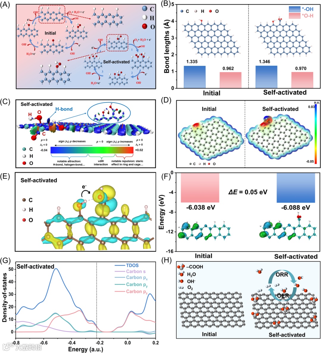 基于实验与理论的交叉印证,提出:自激活过程中原位生成的含氧官能团一方面通过氢键与电荷再分布稳定反应中间体,另一方面重构碳基表面的能级结构与极性分布,使气–液–固三相界面在“化学活性–电子结构–润湿气体输运”三个层级上实现协同优化,从根本上提升了ORR/OER双功能催化的动力学与稳定性。