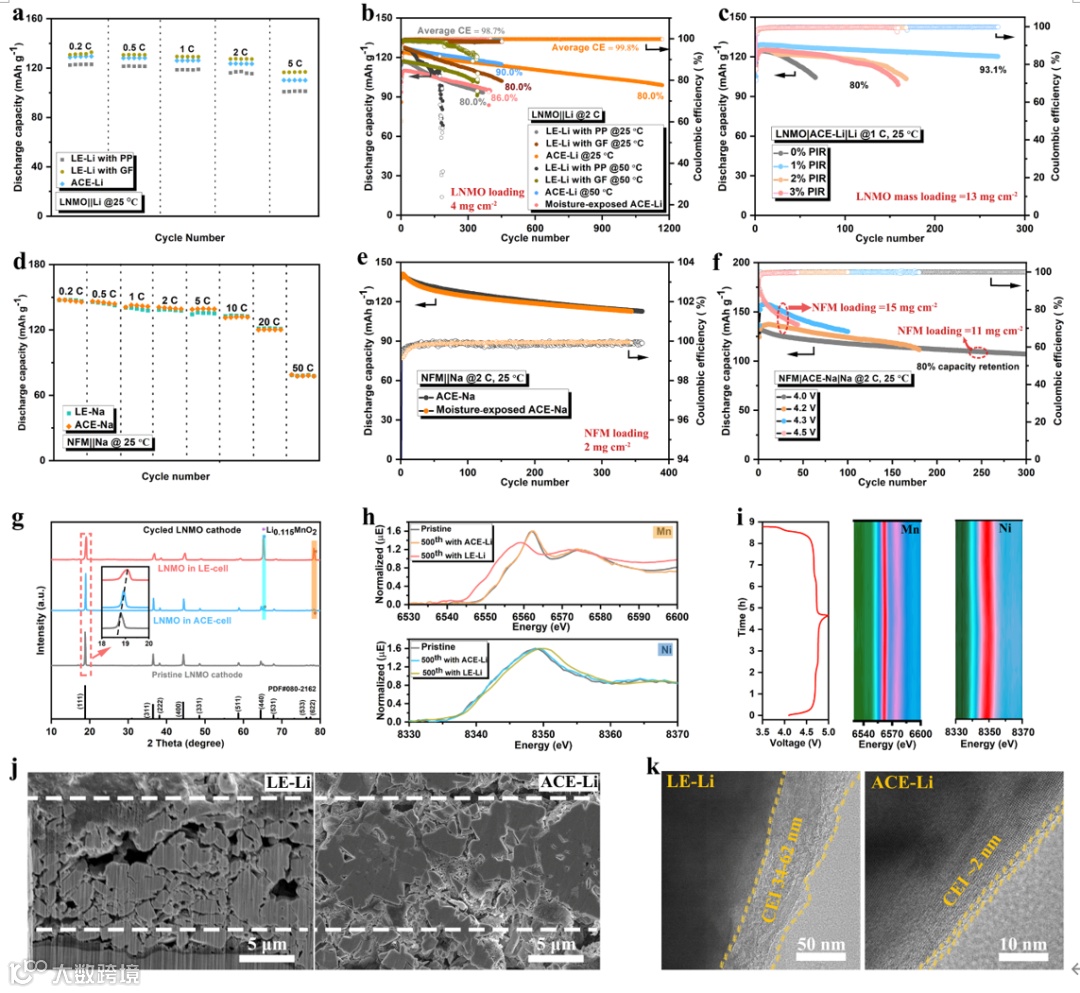 采用ACE和LNMO正极的锂金属电池,正极在3.5 – 5.0 V和室温2 C倍率下的比容量达到124 mAh g-1, 循环寿命超过1,160圈。电池在极端条件下仍能够保持良好的循环稳定性。暴露于1000 ppm H2O或在50°C高温时, 电池在400次循环后仍分别保持了86.0%和91.0%的容量。采用ACE和O3型NFM正极的钠金属电池,正极在室温2 C倍率下的比容量达到142 mAh g-1,循环寿命超过360圈。采用高负载正极的锂/钠金属电池仍能够保持良好的循环寿命。通过XRD,Fib-SEM以及原位和非原位XANES分析证实,采用ACE的锂/钠金属电池,循环后的LNMO和NFM正极其晶体结构保持了较好的完整性。