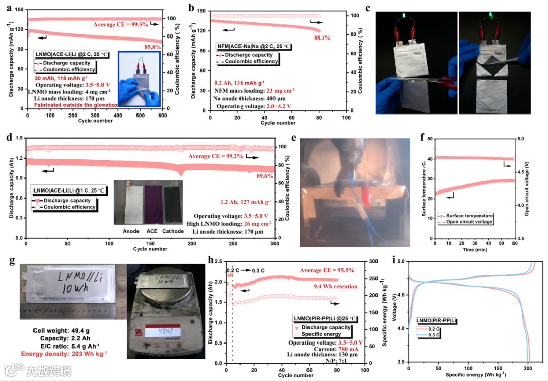 采用ACE和LNMO正极的Ah级软包锂金属电池,在 3.5 – 5.0 V和室温2 C倍率下循环300 次后仍然保持了 89.6% 的容量,并且电池在针刺测试中不起火,不爆炸,表现出了良好的安全性。采用PIR增强的PP隔膜制备了基于LNMO正极的2.2Ah软包锂金属电池,能量密度达到203 Wh kg-1,该工作首次实现了基于LNMO正极的Ah级软包锂金属电池制备。