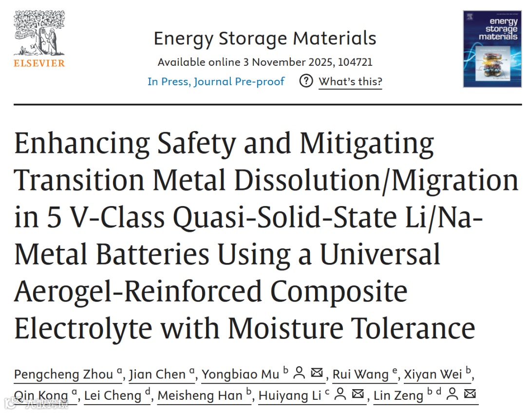 曾林教授、慕永彪博士, Energy Storage Material研究:解决5 V级锂/钠金属电池安全性和循环过程中的过渡金属溶解与迁移
