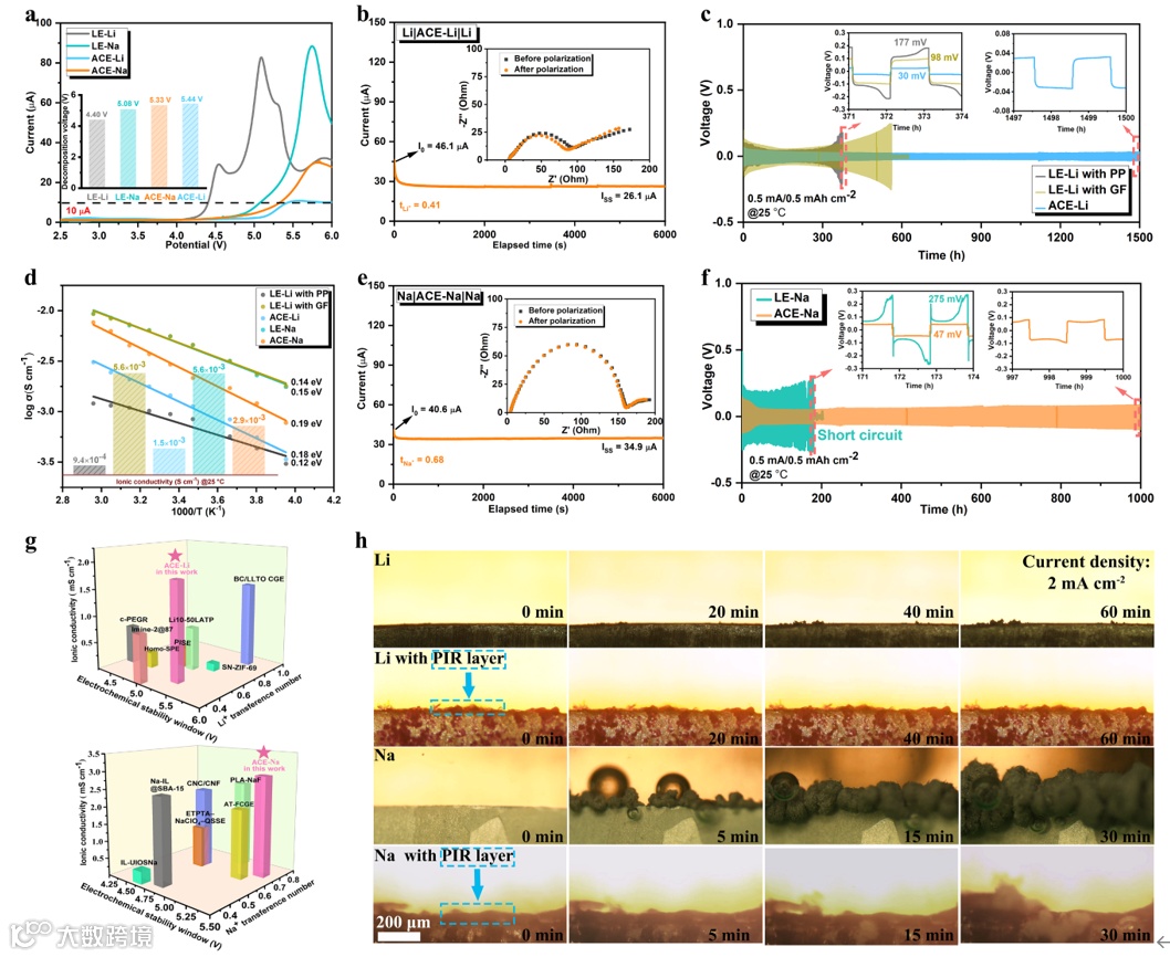图3. 气凝胶增强复合准固态电解质的离子迁移性能和电化学稳定性能。