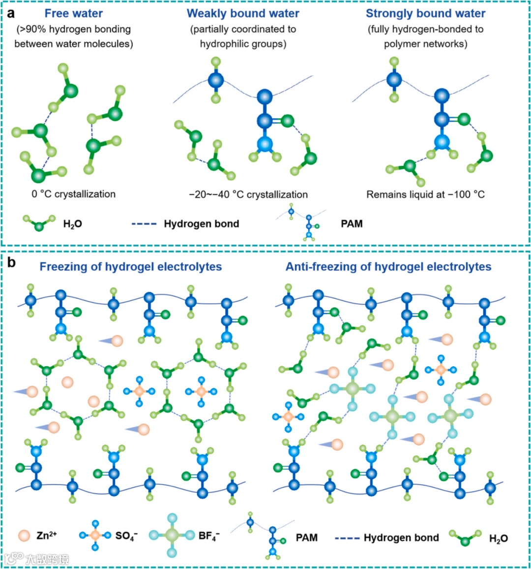 文章首先介绍了水凝胶电解质中水分子的三种不同的热力学状态:1)自由水,这类水分子会在0 °C结冰,导致电解质固化;2)弱结合水,其抗冻能力有所提升,会在-20 °C至-40 °C之间凝固;3)强结合水,借助熵驱动稳定机制,可在-100 °C以下保持液态。这一机理认知为AFHEs的设计带来了两条并行原则:1)引入低温添加剂(如生物质衍生物/盐/醇类),通过竞争作用破坏水分子的氢键网络,从动力学层面抑制冰晶生长;2)通过调控聚合物化学性质,增强水分子与聚合物网络的结合能,将自由水转化为强结合水。