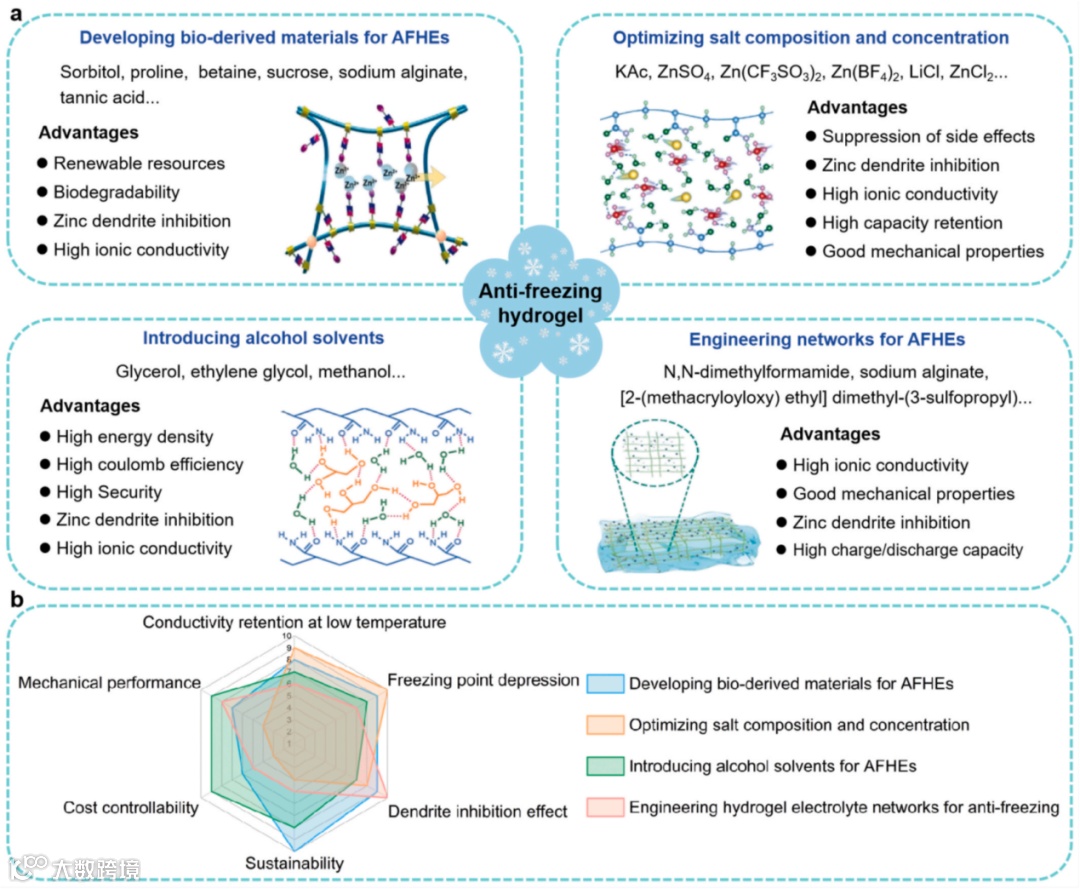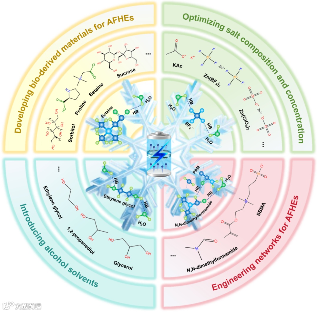 文章总结了开发AFHEs的四种策略:一是利用生物源材料(如山梨醇、海藻酸钠),具有可再生和可生物降解性;二是优化盐的成分与浓度,以获得较高的抗冻性能和离子电导率;三是引入醇类溶剂(如甘油、乙二醇),以提高能量密度和安全性;四是通过工程化网络(如使用有机溶剂和改性聚合物),提升机械性能和离子电导率。