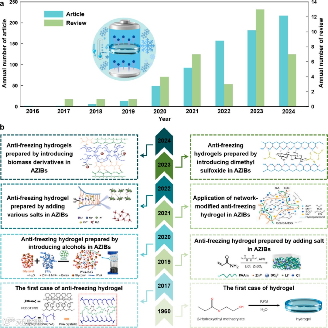 在低温下长期运行这一迫切的需求将AFHEs的研究推进到了先进电池开发的前沿,引发了对基于AFHEs的AZIBs的材料基础创新和实际应用的迅速增长的科学兴趣。文章展示了自2017年首次应用以来,AFHEs在AZIBs中的演变历程,表明其从简单的盐/醇添加发展到诸如引入生物衍生材料和网络改性等更先进的策略,呈现出快速的进步趋势。