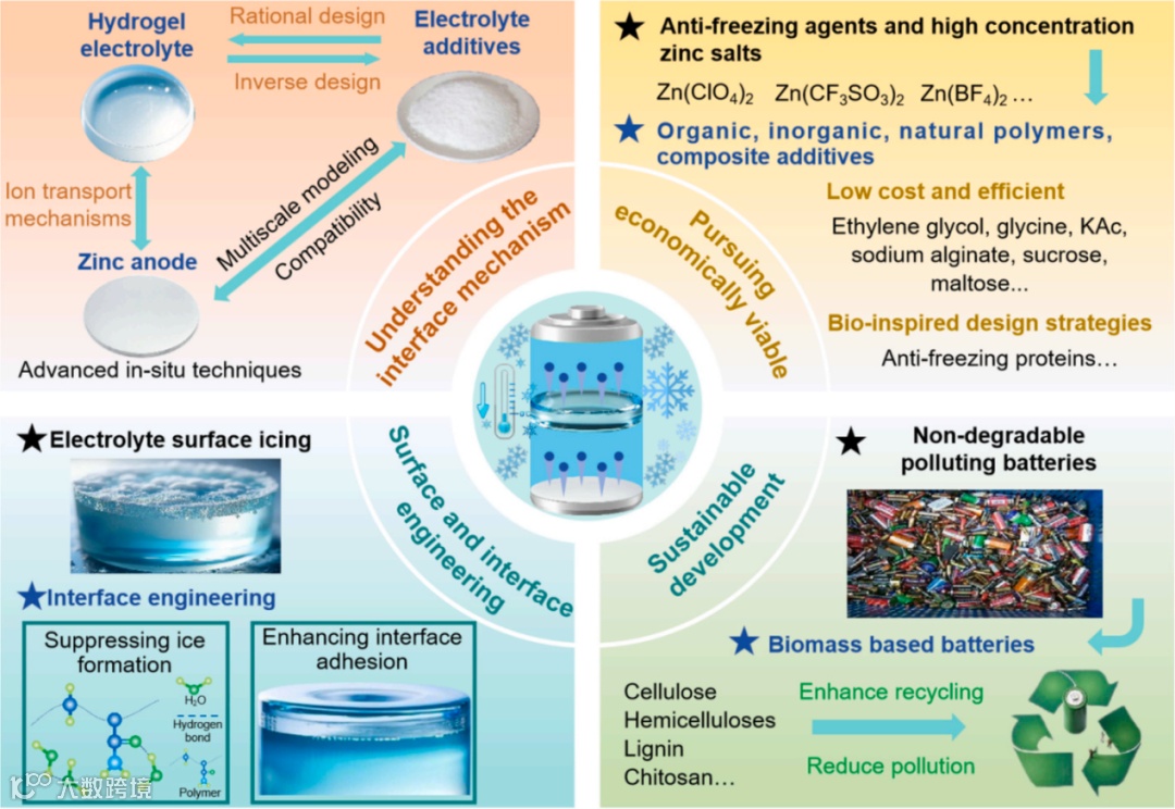 文章综合分析了AZIBs中AFHEs的基础设计原则、分子相互作用的机理分析以及技术瓶颈的关键评估,进一步指出:尽管在协调低温运行稳定性与机械柔韧性方面已取得显著进展,但在材料化学与器件工程的交叉领域,仍存在一些关键挑战。纳米限域条件下离子传输动力学的基础局限性、制备均相聚合物-电解质界面时的规模化限制,以及对长期降解路径的认知不足,这些问题必须通过计算模拟、原位表征技术与仿生材料设计的协同发展来系统解决。通过多学科合作攻克这些挑战,有望使水凝胶基AZIBs成为极端环境下(从极地考察到航空航天应用)储能的关键技术,同时为下一代电解质工程提供具有普适性的见解。