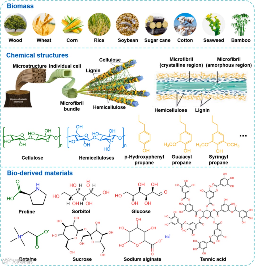 生物质作为一种结构复杂且可再生的资源,因其具有丰富的资源量、成本竞争力、封闭的碳循环可持续性、内在的生物相容性以及多尺度的层级孔隙结构(宏观-中观-微观孔隙的整合)等独特优势,为下一代材料提供了良好的选择。生物质的分级微观结构(如纤维束的多级组装)可与羟基、羧基等极性官能团协同作用,通过分子间氢键构建稳定的受限水网络,进而实现抗冻性能。