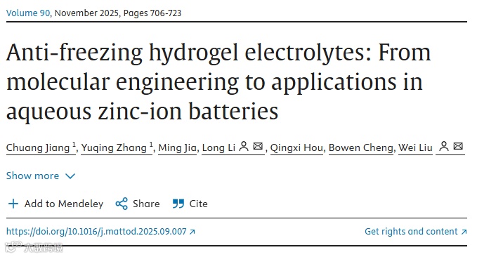 近日,天津科技大学刘苇教授团队,在Materials Today期刊上发表题为Anti-freezing hydrogel electrolytes: From molecular engineering to applications in aqueous zinc-ion batteries的综述文章,通讯作者为刘苇教授和李珑副教授,江闯和张育清为共同第一作者。文章全面总结了AFHEs领域近期的前沿进展,阐明了调控冰晶成核与生长的基本机制。系统阐述了四种关键的电解质设计策略:生物衍生材料开发、盐成分/浓度优化、醇类溶剂引入及水凝胶网络工程,这些策略均以提升AZIBs的应用性能为目标。通过对比评估每种策略的优势与固有局限性,深入分析了决定离子传导、界面动态行为及低温性能的“结构-性能”关联机制。最后,明确指出了下一代基于AFHEs的AZIBs尚未解决的科学瓶颈与新兴研究方向。