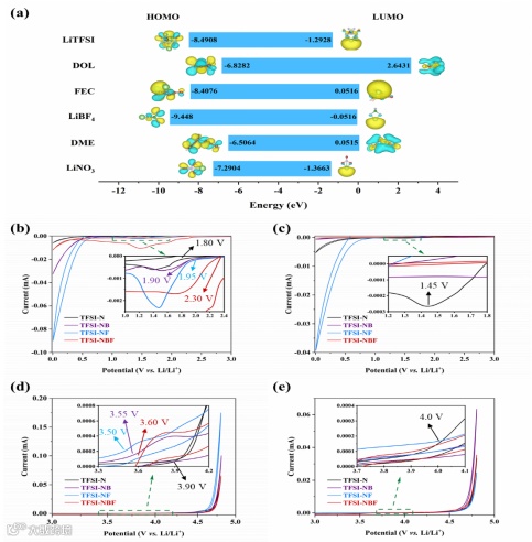 图4. 电解液组分HOMO、LUMO能级计算和CV测试