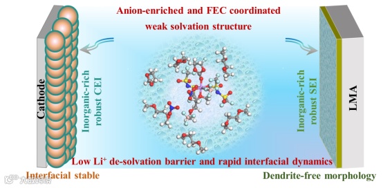 图1. 富阴离子和FEC协同配位锂离子弱溶剂化结构作用机制示意图