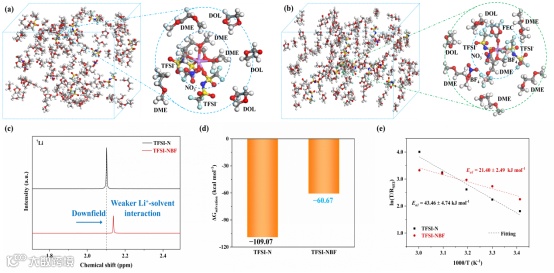 DFT计算表明,多种阴离子(NO3− , TFSI− , BF4−)和FEC分子与锂离子之间具有更强的结合能,使其具有竞争配位优势并优先与锂离子配位。MD模拟,NMR和Raman表征进一步证实,锂离子第一溶剂化壳层主要由多种阴离子和FEC分子协同主导,大幅减少锂离子与电解液中的溶剂分子(DME和DOL)配位,形成特殊的弱溶剂化结构,显著降低锂离子去溶剂化能垒并加速锂离子脱溶剂化过程,增强锂离子传输动力学。