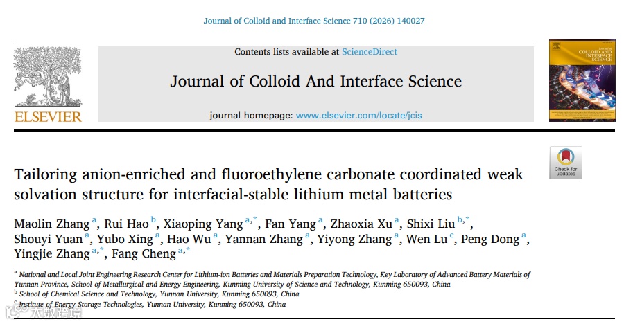 Maolin Zhang, Rui Hao, Xiaoping Yang*, Fan Yang, Zhaoxia Xu, Shixi Liu*, Shouyi Yuan, Yubo Xing, Hao Wu, Yannan Zhang, Yiyong Zhang, Wen Lu, Peng Dong, Yingjie Zhang*, Fang Cheng*. Tailoring anion-enriched and fluoroethylene carbonate coordinated weak solvation structure for interfacial-stable lithium metal batteries. Journal of Colloid and Interface Science 710 (2026) 140027.