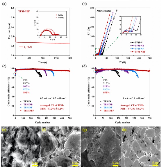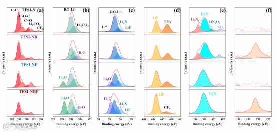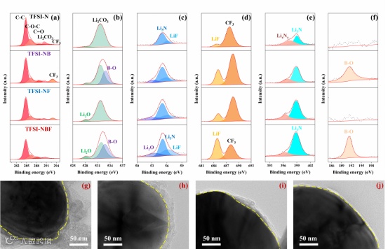 DFT计算、CV测试、XPS分析和TEM观测结果表明,锂离子弱溶剂化结构的形成显著改变了电解液的热力学稳定性和氧化还原特性,使得第一溶剂化壳层内配位的多种阴离子和FEC分子在电极表现优先发生氧化还原分解,参与EEIs形成。并且,分解产生的大量功能化无机组分(如LiF, Li3N, B-O, Li2O等)显著改善EEIs电化学性质、形貌结构、离子电导率和机械性能,从而实现富无机组分功能化EEIs的重构,显著提升EEIs循环稳定性。