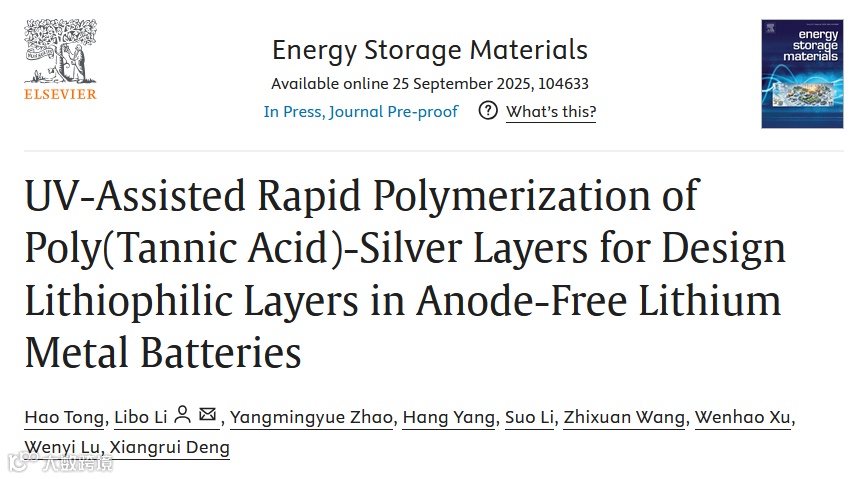 紫外光辅助聚单宁酸复合银层的快速聚合用于无负极锂金属电池中的亲锂层设计