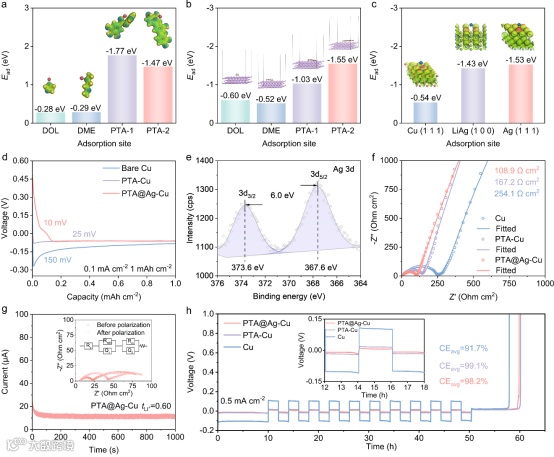 图3. (a) Li+与(b) Li基底在DME、DOL、PTA-1和PTA-2中的吸附能比较。插图:模型示意图。(c) Cu、LiAg和Ag表面Li+吸附能比较。(d) 电流密度为0.1 mA cm-2时初始锂沉积的容量电压曲线。(e) Li成核后PTA@Ag-Cu负极的Ag 3d XPS谱。(f) 循环后半电池的电化学阻抗谱(EIS)。(g) 采用Li-PTA@Ag-Cu负极的对称电池恒电流极化曲线。(h) CE测试中PTA@Ag-Cu、PTA-Cu和Cu负极库仑效率对比。