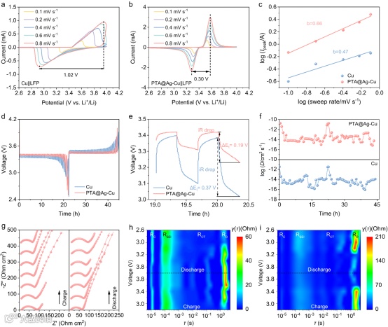 图9. 在0.1至0.8 mV s-1的扫描速率范围内,获得的(a) Cu||LFP和(b) PTA@Ag-Cu||LFP全电池循环伏安曲线。(c) 用于估算Li+传导动力学的log(i)与log(v)关系图。(d) 充放电过程中的GITT曲线,(e) 局部放大图像。(f) 基于GITT计算的离子扩散系数。(g) PTA@Ag-Cu||LFP电池的恒电流电化学阻抗谱(GEIS)。(h) PTA@Ag-Cu||LFP电池与(i) Cu||LFP电池的GEIS衍生的动态阻抗曲线(DRT)。