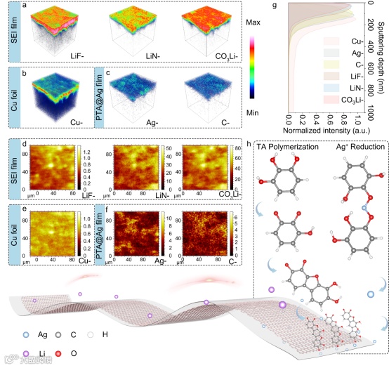 图6. PTA@Ag-Cu||LFP电池循环后,负极表面PTA@Ag薄膜的TOF-SIMS三维图:(a) SEI膜中的LiF、LiN和CO3Li信号,(b) Cu箔中的Cu信号,(c) PTA@Ag薄膜中的C和Ag信号。对应的TOF-SIMS映射图:(d) LiF、LiN、CO3Li信号分布,(e) Cu信号分布,(f) C、Ag信号分布。(g) 循环后PTA@Ag-Cu负极的TOF-SIMS深度剖面结果。(h) PTA@Ag薄膜合成过程示意图。
