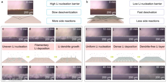 图7. 采用原位光学显微镜观察到的(a) Cu负极和(b) PTA@Ag-Cu负极表面原位镀锂形态。在电流密度为2 mA cm-2条件下,(c-h) Cu箔表面及(i-n) PTA@Ag-Cu表面经过10-60分钟镀锂形成的锂沉积层。