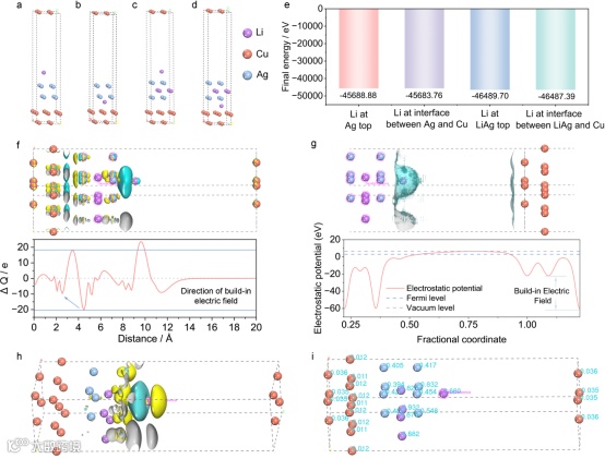 图4. 改性Cu集流体表面Li+沉积模拟。Li+沉积于:(a) Ag-Cu表面,(b) Ag层与Cu层界面,(c) LiAg合金表面,(d) LiAg合金层与Cu层界面模型。 (e) 上述四种模型的系统能量。(f) 系统整体电荷转移曲线与电子密度差:蓝色表示电子富集,黄色表示电子损失。(g) Ag-Cu负极上Li+沉积的静电势曲线。(h) Ag-Cu负极上Li原子的电子密度差。(i) 含沉积Li原子的Ag-Cu负极系统电荷分布。