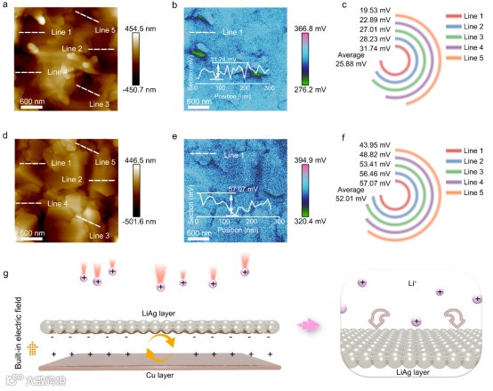 图5. 开尔文探针力显微镜分析。(a) 循环Cu负极的原子力显微镜图像及(b) 表面电位分布图。(c)Cu负极表面电位值的统计比较。(d) PTA@Ag-Cu负极的原子力显微镜图像及(e) 表面电位分布图。(f) PTA@Ag-Cu负极表面电位值的统计比较。 (g) 内置电场优化下的Li沉积机制示意图。