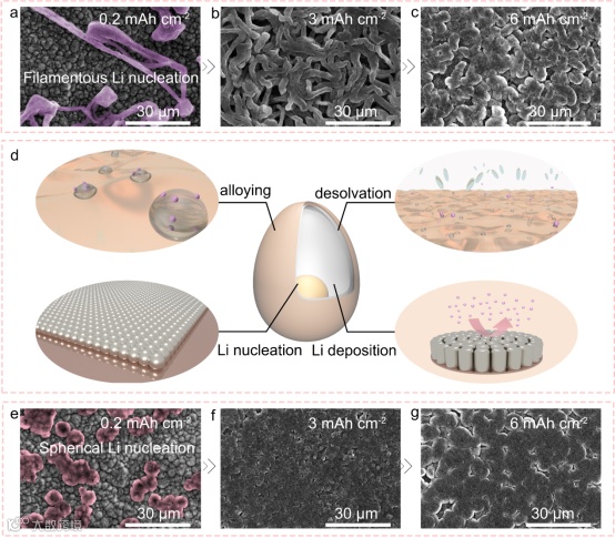 图8. PTA@Ag-Cu负极在不同锂沉积容量下的SEM图像:(a) 0.2 mAh cm-2,(b) 3 mAh cm-2,(c) 6 mAh cm-2。(d) 改性策略示意图。Cu负极在不同锂沉积容量下的SEM图像:(e) 0.2 mAh cm-2,(f) 3 mAh cm-2,(g) 6 mAh cm-2。