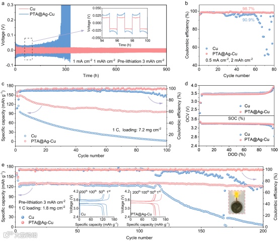 图10. (a) 在Cu和PTA@Ag-Cu表面以3 mAh cm-2进行预锂化处理后,组装的Li||Li-Cu和Li||Li-PTA@Ag-Cu半电池在1 mA cm-2、1 mAh cm-2条件下循环的时间-电压曲线。(b) 在0.5 mA cm-2和2 mAh cm-2条件下,Li||PTA@Ag-Cu和Li||Cu半电池中锂沉积/剥离的电化学电位。(c) PTA@Ag-Cu||LFP和Cu||LFP全电池在1 C倍率下的循环性能。(d) PTA@Ag-Cu||LFP与Cu||LFP全电池在0.1-2C不同倍率条件下的循环性能。(e) 在PTA@Ag-Cu与Cu表面预锂化3 mAh cm-2后组装的Li-PTA@Ag-Cu||LFP与Li-Cu||LFP全电池,在1C下的循环性能。
