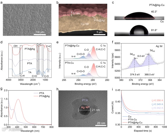 图2. PTA@Ag-Cu的结构表征。PTA@Ag-Cu的(a) 表面SEM图像,(b) 横截面SEM图像。(c) PTA@Ag-Cu与Cu的接触角。(d) 稀释TA、PTA及PTA@Ag溶液的FTIR光谱。(e) PTA@Ag-Cu与Cu的C 1s XPS光谱。(f) PTA@Ag-Cu的Ag 3d XPS光谱。(g) 稀释PTA与PTA@Ag溶液的紫外光谱。(h) PTA@Ag-Cu表面PTA@Ag薄膜的透射电子显微镜图像。(i) SS|Cu|SS、SS|PTA-Cu|SS及SS|PTA@Ag-Cu|SS对称电池随时间变化的直流极化曲线。