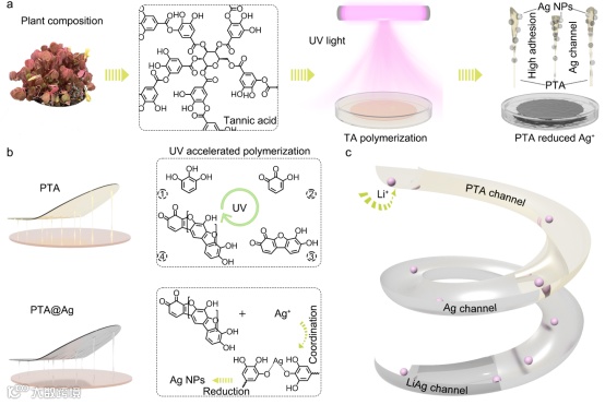 图1. (a) PTA@Ag-Cu的制备过程。(b) TA聚合与Ag+还原的工艺流程及电极示意图。(c) PTA、Ag和LiAg通道中Li+迁移的示意图。