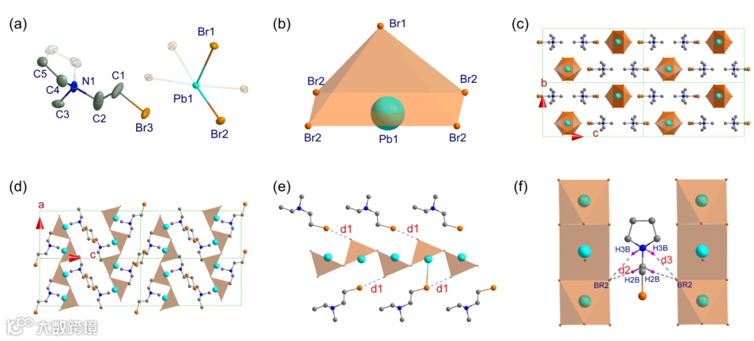 团队通过溶液挥发法制备得到白色针状晶体,变温单晶 X 射线衍射分析表明,两种化合物在高、低温相均属于正交晶系 Pnma,同时具备优异的结构稳定性。该体系的核心结构特征为“半定向 PbX5 四方锥链”,其在卤化铅基杂化体系中极为罕见。[PbX5]3- 单元沿 a 轴边共享连接形成 1D 无机链,而有机阳离子 [XMePyr]+ 以范德华力与氢键填充链间空间,实现了有机–无机相的紧密耦合。这种结构特征为后续的热响应行为提供了稳定骨架和可调控通道。