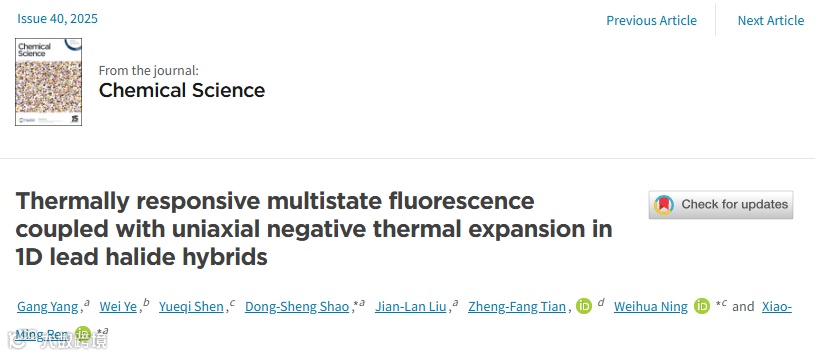 相关工作以《Thermally Responsive Multistate Fluorescence Coupled with Uniaxial Negative Thermal Expansion in 1D Lead Halide Hybrids》为题在《Chemical Science》上发表。