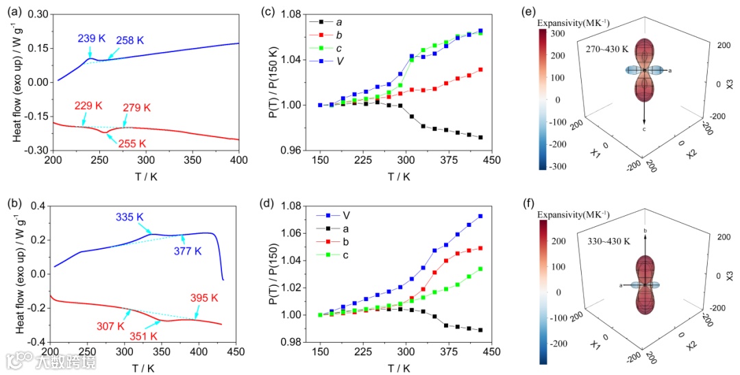 差示扫描量热(DSC)结果表明,两种化合物均经历可逆同构相变,且相变与热膨胀行为密切相关。三次加热–冷却循环后相变峰位置未发生变化,显示出优良的循环可逆性。更为关键的是,两种化合物在 a 轴方向表现出显著的单轴 NTE 行为:低温相中 a 轴几乎零膨胀(ZTE),而高温相中 a 轴转为明显收缩。机理研究揭示,NTE 源于链内卤素离子的横向振动(垂直于 a 轴),这一机制与石墨烯面内收缩效应相似,在 1D 卤化铅基体系中为首次报道。