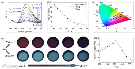荧光测试进一步揭示了热膨胀与发光的耦合特性。1 在不同激发下呈现带边发射与自陷激子发射的双发射行为,且发射强度比随温度线性变化(203–253 K 区间线性相关系数 0.993),伴随荧光颜色从红向蓝的可逆转变,显示其在低温传感领域的潜力。2 则表现出典型的自陷激子发射及“负热猝灭”现象,随着温度升高,发光强度反而增强(203–283 K),283 K 以上转为常规热猝灭,其转折点与相变温度一致,进一步印证了结构与光学行为的深度耦合。