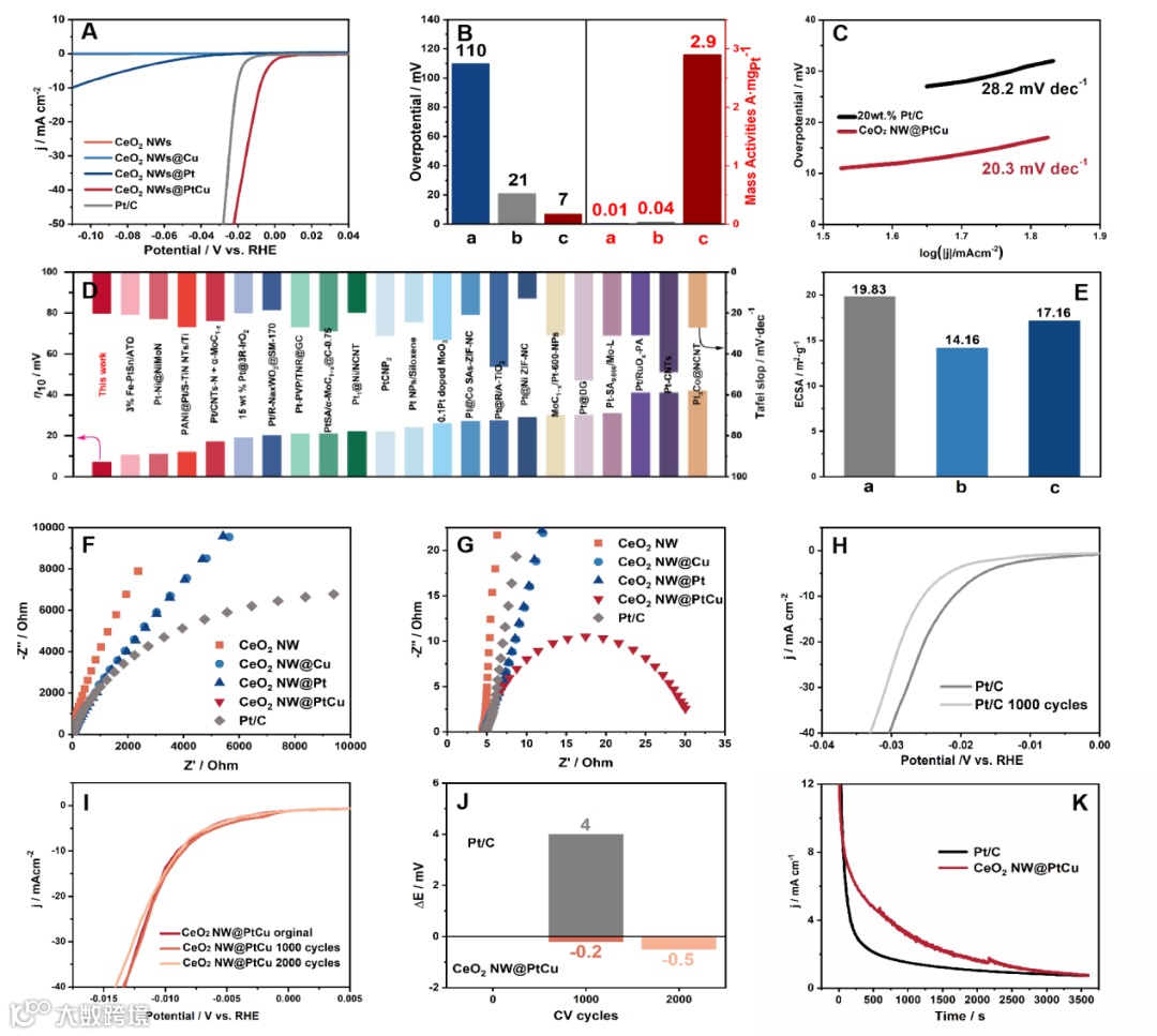 图3 CeO2 NW, CeO2 NW@Cu, CeO2 NW@Pt, CeO2 NW@PtCu和Pt/C的HER活性曲线(A). B, 电势在10 mV时的过电位和质量活性(图中a, b, c分别代表CeO2 NW@Pt, Pt/C, and CeO2 NW@PtCu). C, Pt/C和CeO2 NW@PtCu的塔菲斜率. D, 文献报道的电势在10 mV时的过电位和塔菲斜率. E,20 wt.% Pt/C (a), CeO2 NW@Pt (b), and CevO2 NW@PtCu (c)的电化学活性面积. F和G, CeO2 NW, CeO2 NW@Cu, CeO2 NW@Pt, Cev NW@PtCu和 Pt/C在0.6 V电势下的能奎斯特曲线. Pt/C 循环1000圈后(H)及CeO2 NW@PtCu 循环2000圈后(I)的HER活性,及加速实验后的过电位变化(J). K, CeO2 NW@PtCu和Pt/C的计时电流曲线.