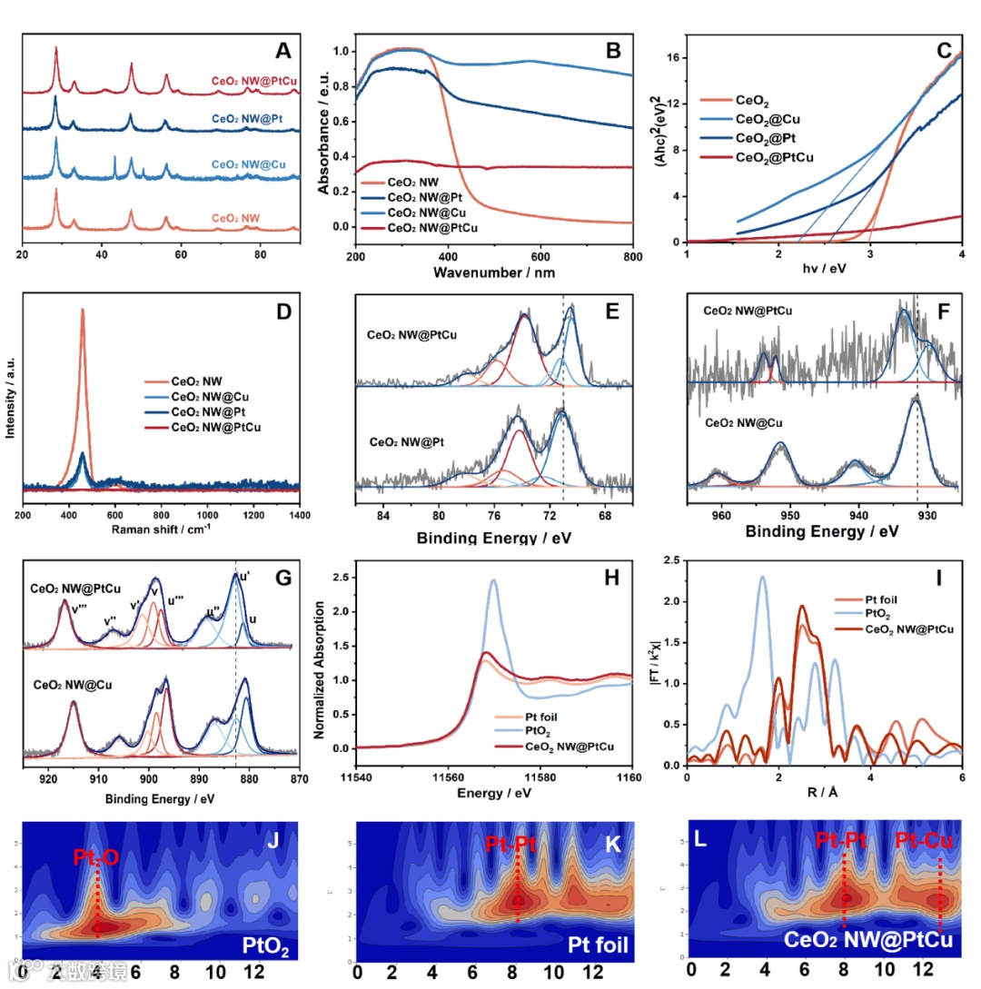 图2 CeO2 NW, CeO2 NW@Cu, CeO2 NW@Pt, and CeO2 NW@PtCu的XRD (A), UV-vis (B)及Tauc plot (C), Raman (D)图谱;Pt 4f (E), Cu 2p (F), Ce 3d (G)的XPS图谱;CeO2 NW@PtCu中Pt L3-edge的X射线吸收近边光谱 (H) 和Flourier变换的扩展X射线吸收精细结构(I), 以及PtO2 (J), Pt foil (K), CeO2NW@PtCu (L)的小波变换图.