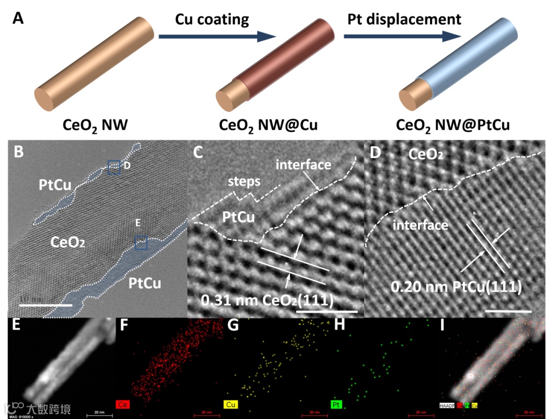 图1 CeO2 NW@PtCu制备过程示意图(A),TEM图片(B-D)及元素分布(E-I)。图B中的比例尺为10 nm,图C和D中的比例尺为1 nm.