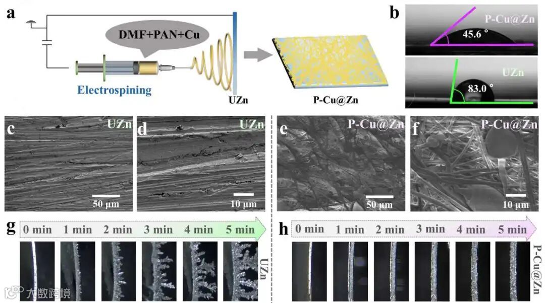 图1. (a) 静电纺丝法制备P-Cu@Zn的示意图。(b) 不同电极与电解质的接触角。(c,d) UZn和(e,f)P-Cu@Zn的SEM图像。(g)UZn和(h)P-Cu@Zn电极在250 mA cm-2下沉积Zn的原位光学显微镜图。