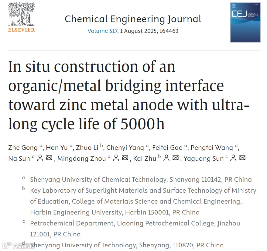 近日,沈阳化工大学周明东团队与哈尔滨工程大学、辽宁石油化工高等专科学校、沈阳工业大学合作,在国际知名期刊Chemical Engineering Journal上发表题为“In situ construction of an organic/metal bridging interface toward zinc metal anode with ultra-long cycle life of 5000 h”的研究型文章。该文章采用静电纺丝法在锌阳极上原位构建了有机/金属桥接界面,不仅展示了一种有效的界面修饰策略来促进[Zn(H2O)6]2+的脱溶和改善电子转移,而且为水系锌离子电池中稳定锌阳极的构建提供了有价值的见解。