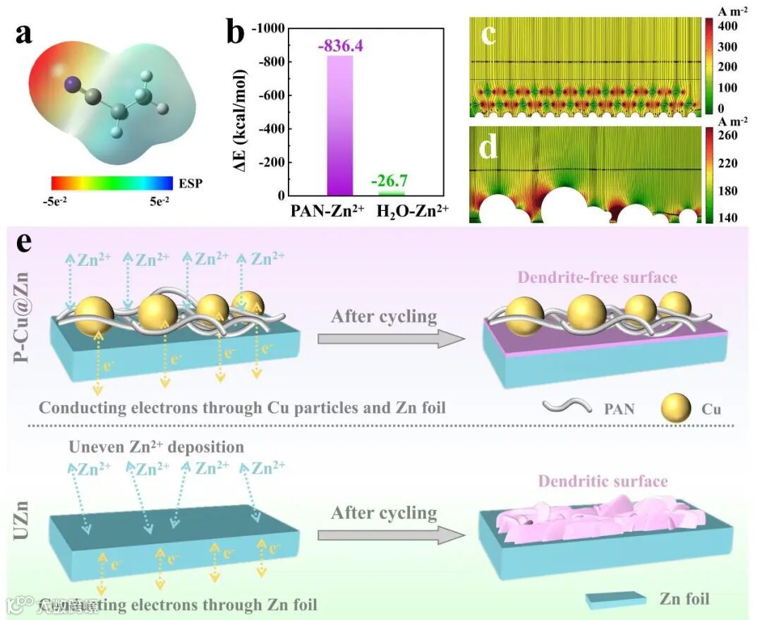 图4. (a) PAN的静电电位映射(ESP)。(b) PAN-Zn2+和H2O-Zn2+的结合能。(c) UZn和(d) P-Cu@Zn电流密度分布模拟。(e)电极界面示意图。