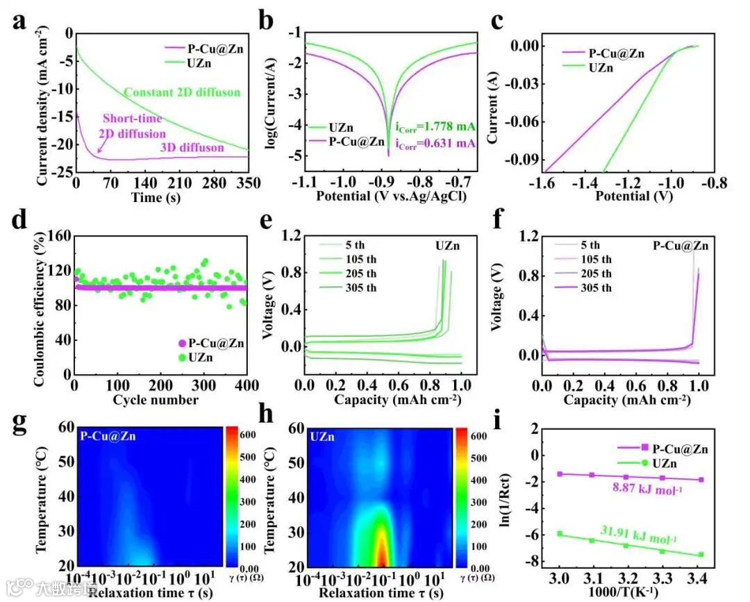 图3. (a) UZn和P-Cu@Zn在-150 mV的计时电流曲线。(b) P-Cu@Zn和UZn的Tafel曲线和(c) LSV曲线。(d) UZn||Cu和P-Cu@Zn||Cu半电池的库仑效率。(e) UZn和(f) P-Cu@Zn的容量-电压曲线。(g) P-Cu@Zn和(h) UZn的DRT分析。(i) UZn和P-Cu@Zn的Arrhenius曲线。