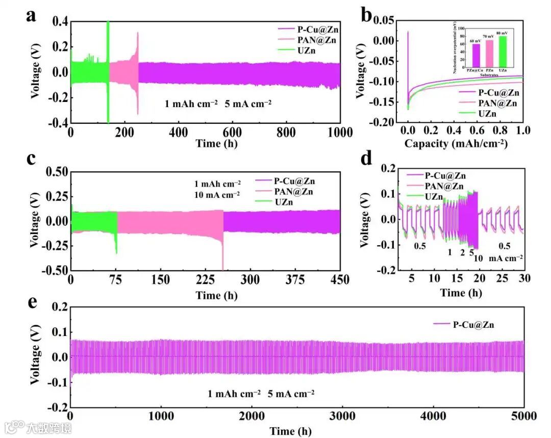 图2. 对称电池在(a) 1 mA cm-2和(c) 10 mA cm-2下的循环性能。(b) 5 mA cm-2下锌沉积的成核过电位。(d) 对称电池的倍率性能。(e) P-Cu@Zn||P-Cu@Zn对称电池的循环静置性能。