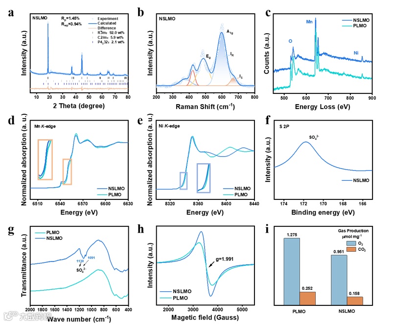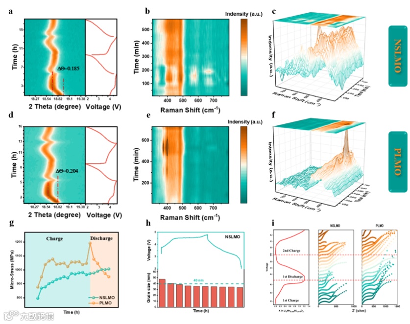 原位XRD和拉曼光谱实时记录了材料在充放电过程中的结构变化。结果显示,NSLMO的特征峰位移幅度远小于未改性的样品,说明其层状骨架的膨胀收缩被有效抑制,结构波动更小,更加稳定。