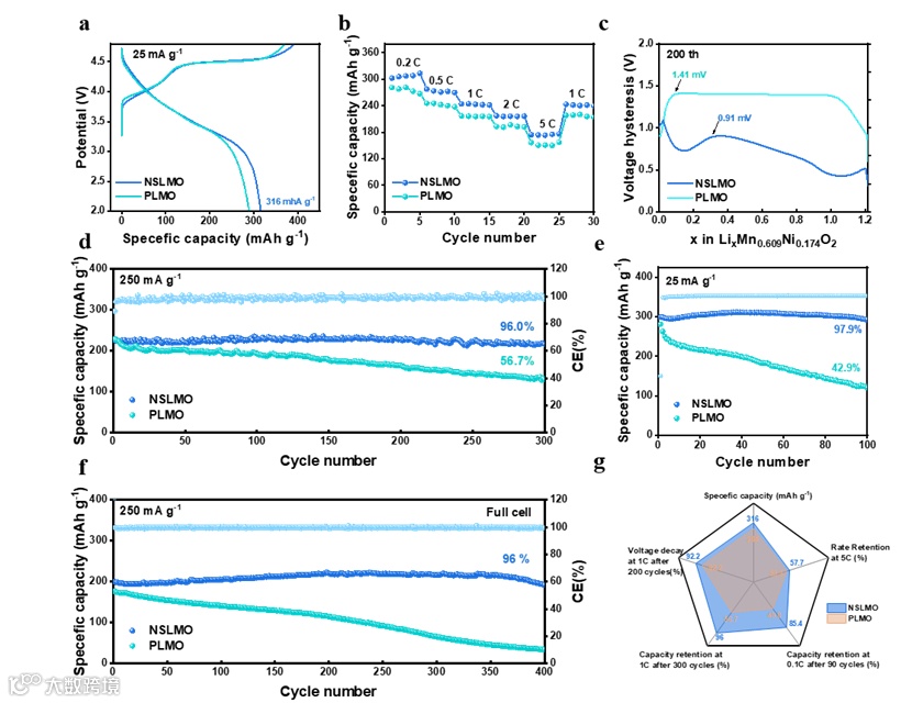 超高容量:改性后的正极NSLMO在0.1C倍率下,首次放电容量高达316 mAh/g,展现出其高能量密度的本色。